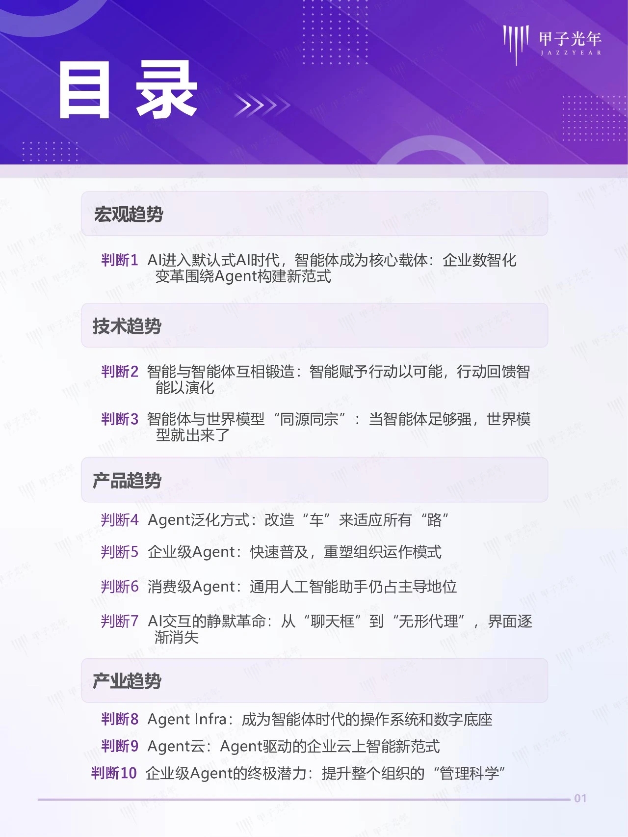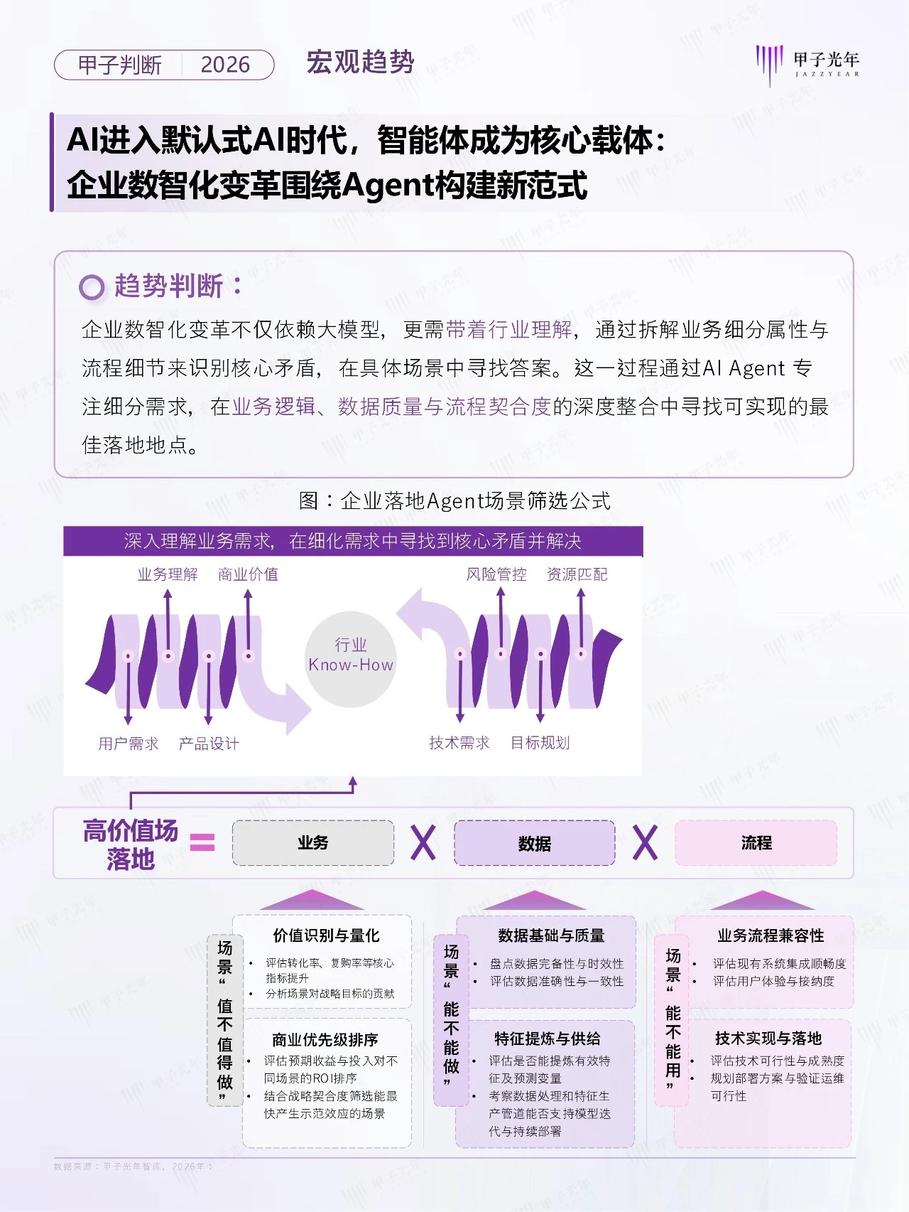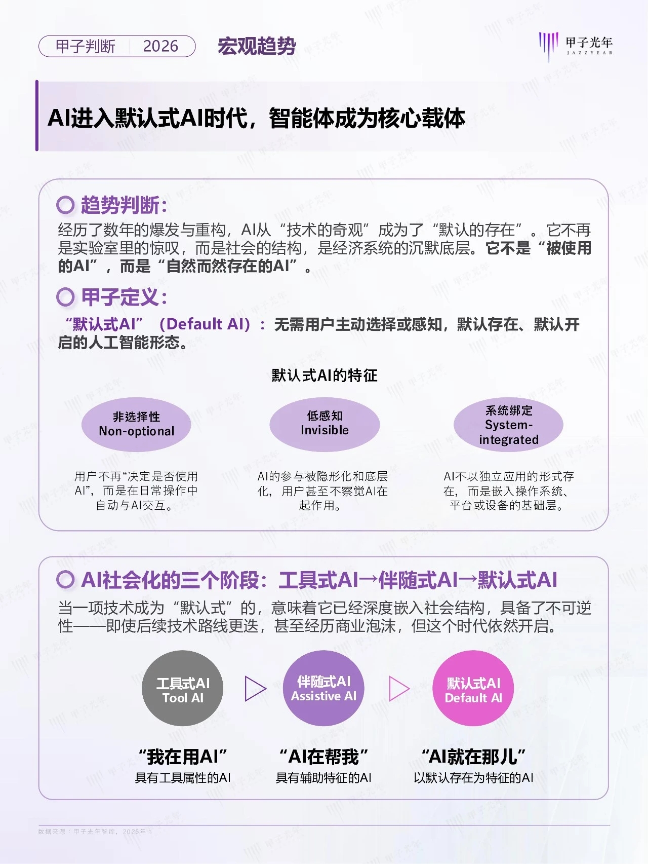 近日,甲子光年智库发布《2026年 Agent领域十大趋势判断报告》,系统梳理智能体(Agent)技术演进、产品落地与产业变革方向。报告指出,AI 已迈入 “默认式 AI” 时代,智能体成为核心载体,从技术架构、产品形态到产业生态,正全方位重构数字化发展范式。