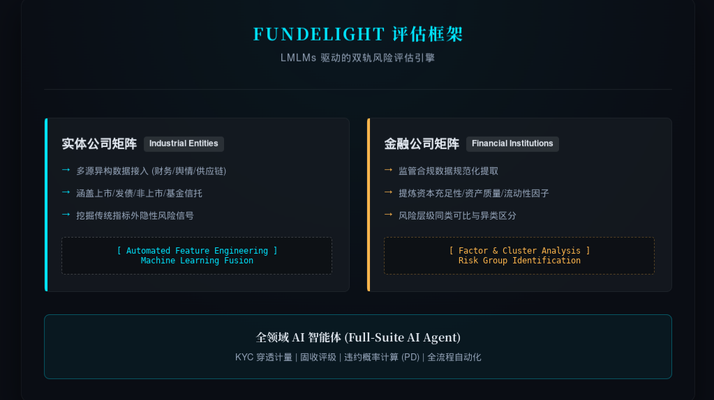 该框架的创新之处在于:一是将基金与信托公司纳入实体大类,充分结合富德生态的业务特点,实现对集团投资标的的全覆盖;二是针对不同类型企业采用差异化的技术路线,既保证了评估的精细化,又兼顾了数据资源的可行性。目前,该框架已全面落地,为德明灯后续的功能延展提供了坚实的底层支撑。未来,德明灯将成为覆盖企业投资 KYC、一级市场、二级市场、固定收益市场的全系列AI 智能体产品,能够实现从企业穿透式风险计量、信用评级,固定收益率市场主体评级、债项评级及收益率曲线和违约概率的精确计算,实现全流程自动化风险评估,为资管业务提供全方位智能支撑。