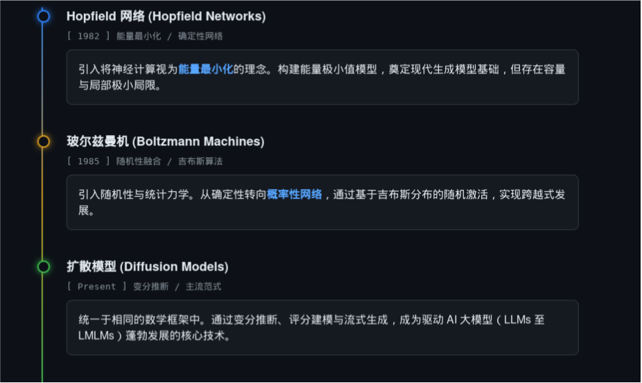 为配分函数,T 是温度参数。这一形式化将神经网络转变为概率模型,其中较低能量的状态具有更高的出现概率。这样,扩散模型就成为主流范式: 这个思想谱系是从Hopfield网络到基于Hinton与Sejnowski提出的玻尔兹曼机中随机性的引入并与热力学体系的融合而发展到今天的扩散模型形态, 她通过基于随机算法模拟的变分推断、评分建模与流式生成,统一于相同的数学框架中, 从而推动人工智能大模型的蓬勃发展。