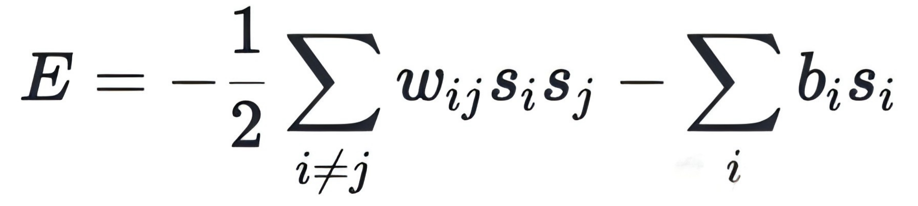 其中,L 代表损失函数(例如交叉熵损失),N 表示模型参数的数量,α和β 是凭场景专业知识校对的参数,而 L∞ 代表不可约损失底限 (即,在给定无限计算资源的情况下,理论上可实现的最小损失模型参数、训练数据和计算资源)。基于缩放定律(scaling law),即模型能力随规模演变的数学关系,引发机器学习系统达到足够大时产生涌现现象(emergence)。大模型不仅是大语言模型,还包括图像合成、视频生成与多模态内容创作,这背后是基于我们所称的大数学逻辑模型(LMLM,以下简称“大逻辑模型”)。这样,扩散形态的数学模型已成为主流范式。这里,我们简要回顾一下扩散模型的发展历史。其实,现代扩散模型的概念可追溯至John Hopfield于1982年在联想记忆网络方面的开创性工作。Hopfield网络引入了将神经计算视为能量最小化的革命性理念,这一概念来自统计物理。在Hopfield网络中,由N个二元神经元(si)构成的集合被赋予一个能量: