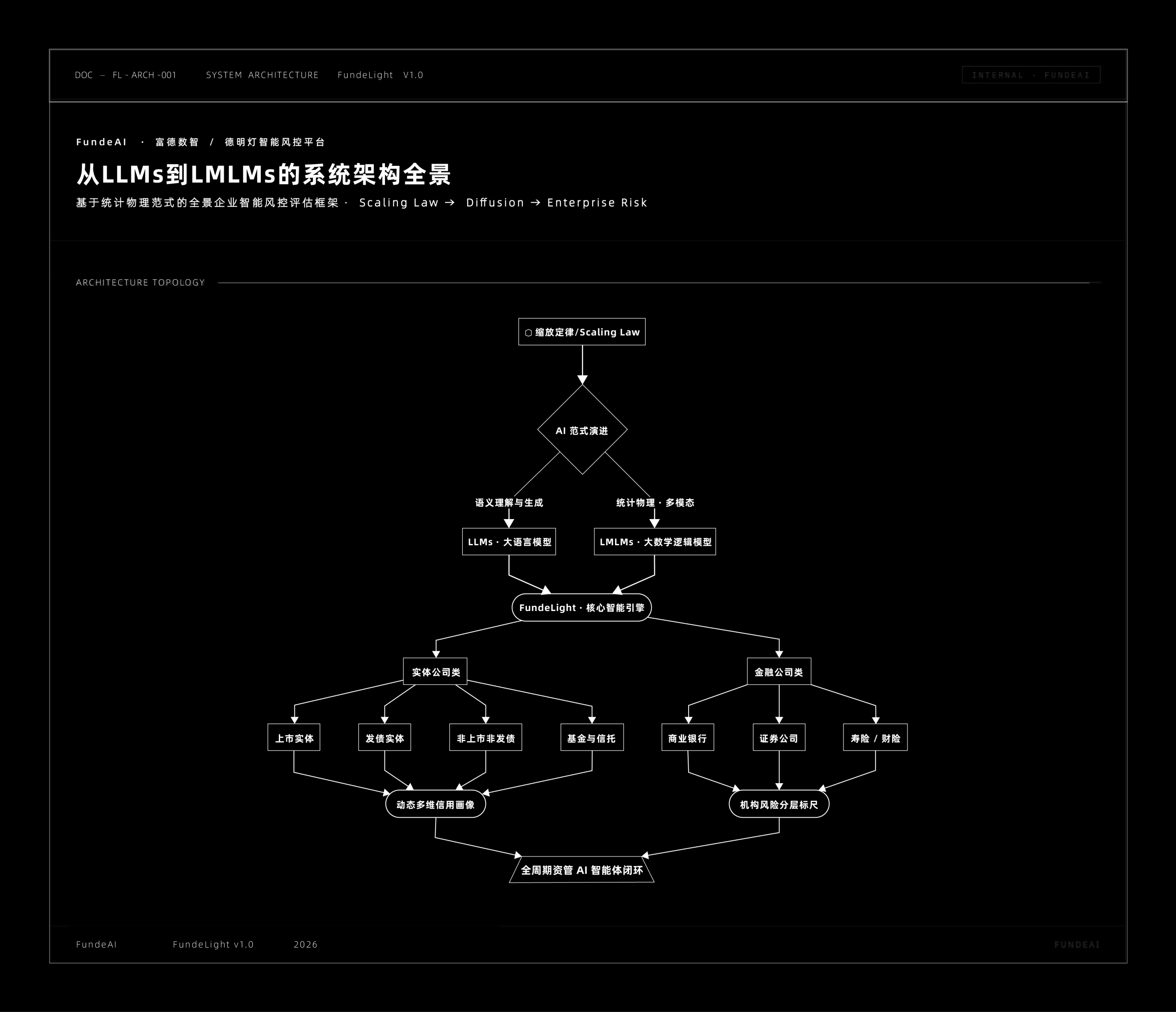 近日,富德数智(FundeAI)自主研发的德明灯(FundeLight)正式投入市场应用。德明灯是面向投资管理场景推出的人工智能产品,以AI+本体为底层数据工具平台,基于从大语言模型(LLMs)到大逻辑模型(LMLMs)的原创框架,广泛覆盖各类企业主体的智能评估。本文将以德明灯1.0版本的实践入手,对其逻辑进行解读。
