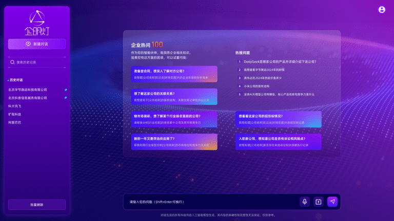 基于智能AI大模型的企业数据智能分析平台,通过自然语言交互,一键生成企业全息画像与信用报告,为投资、信贷、合作与监管提供精准、高效的数据洞察与决策支持。